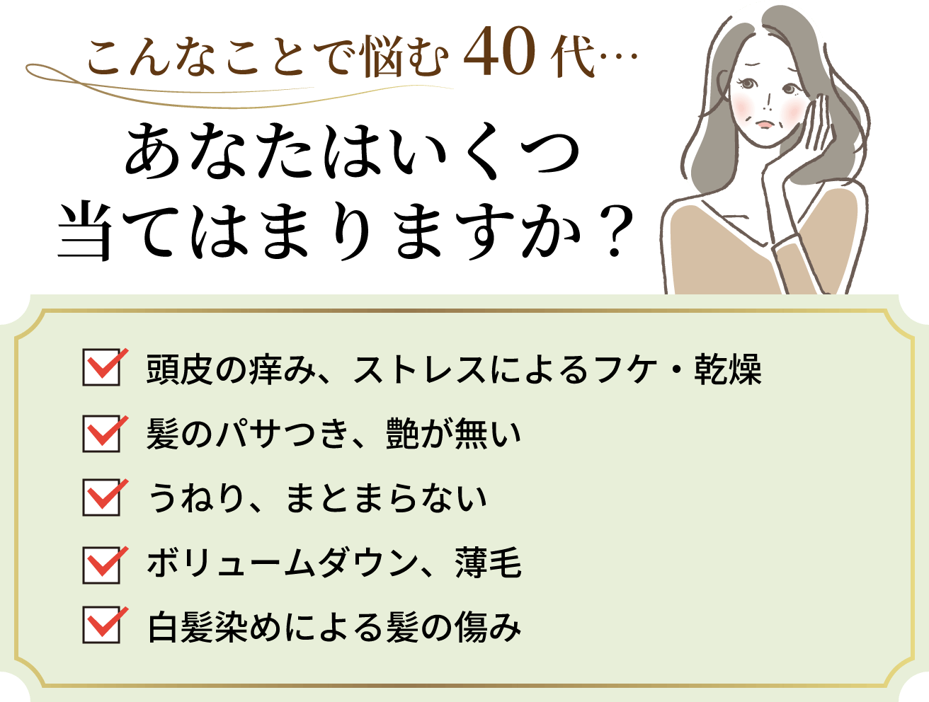 アラフォー世代特有の髪のお悩みや、お困りごとを解決したいと思い、40 代女性の方をメインターゲットにしたオールインワンシャンプーを開発しました。