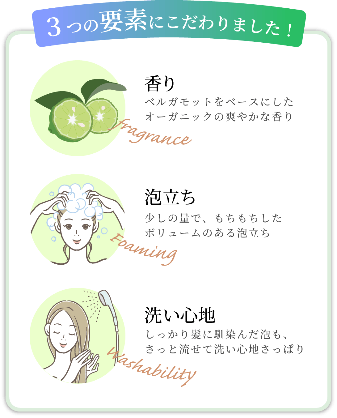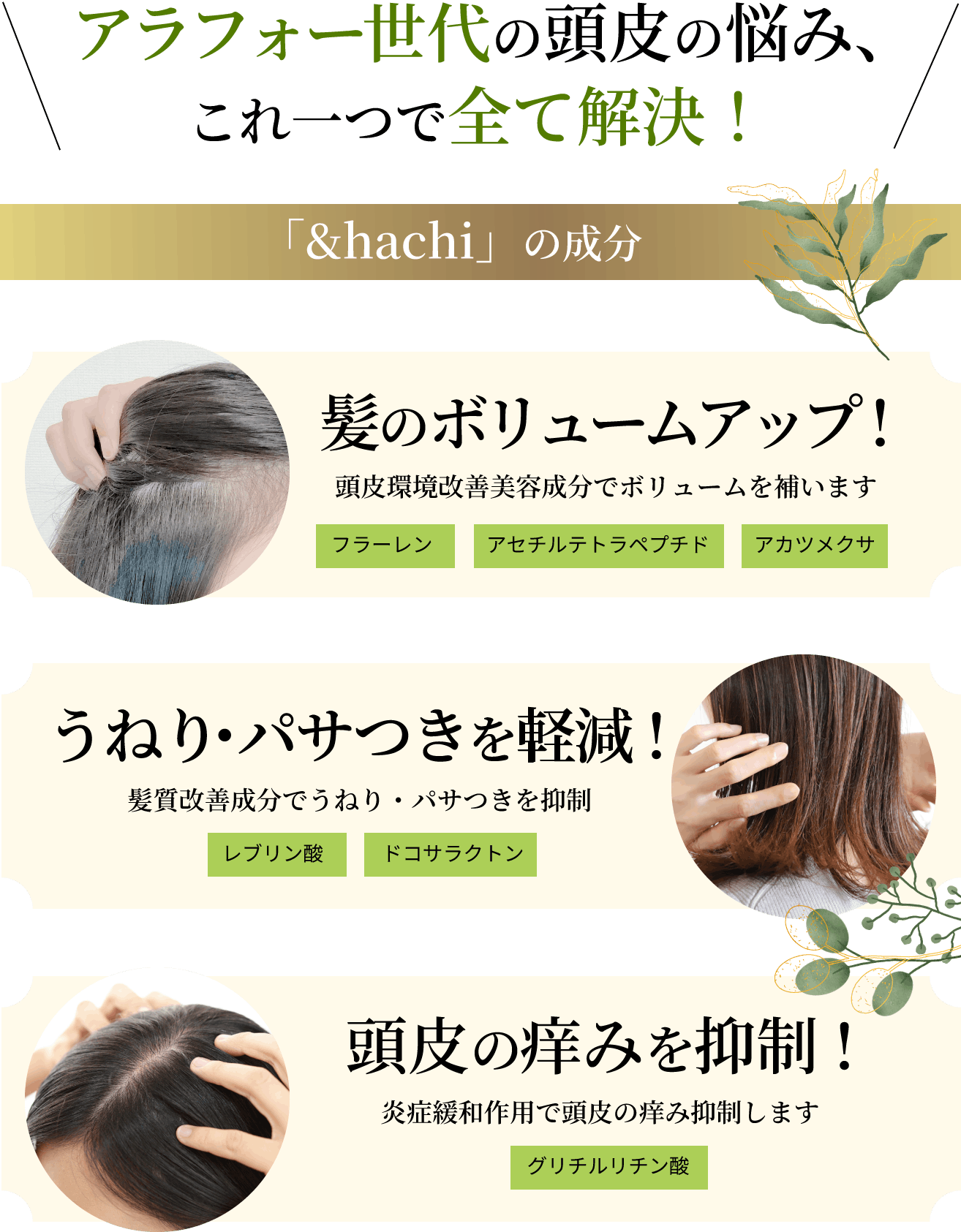 そして、主なお客様である30代〜50代女性の髪の悩みに着目。40代頃から現れる年齢による髪の悩みに着目して『うねり・パサつき・艶』を緩和する成分を配合しました。