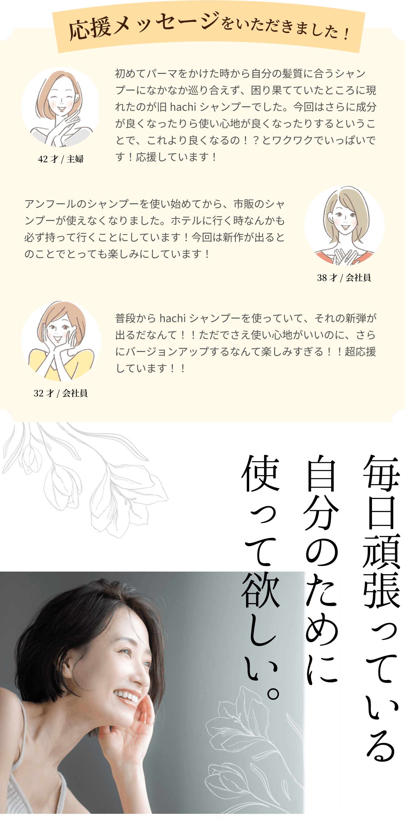 世代特有のお悩みやお困りごとを解決したいと思い、40 代の方をメインターゲットにしたオールインワンシャンプーを開発しました。長年アラフォー世代の頭皮・髪を触り続けてきたからこそわかる必要な成分を詰め込みました。ぜひご協力をお願いいたします。