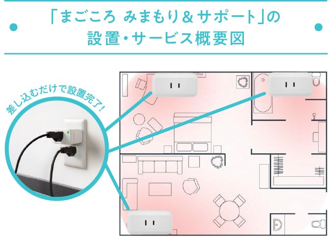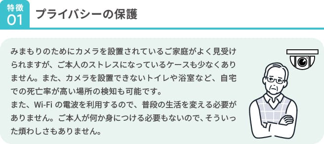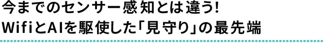 Wi-Fiセンシング技術を活用した最先端技術による24時間365日寄り添うITみまもりの提案です。「まごころみまもり&サポート」は、Wi-Fiセンサーによる「AIの目」と定期訪問による「人の目」を組み合わせた今までありそうでなかった画期的なみまもりです。AIと人を掛け合わせることにより、他のセンサーや見守りサービスにはない3つの特徴を紹介します。