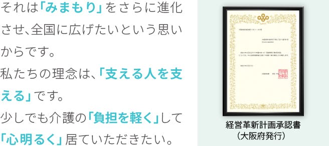 私たちのみまもりの仕組みは、2022年9月には大阪府経営革新にも承認されました。その仕組みを全国に届けて、日本の超高齢社会の未来を明るいものにしたい。