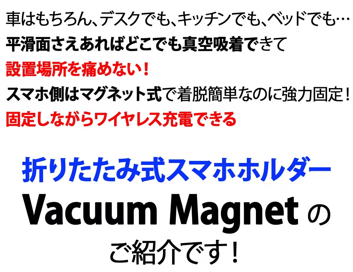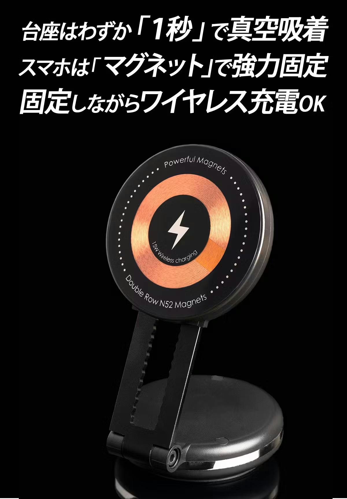 真空吸着で平滑面に強力固定、跡も残さず安心使用!さらにワイヤレス充電対応で、スマホを置くだけで充電可能。コンパクトに折りたためて持ち運びも便利!スマホやタブレットの使い勝手がさらに快適に!