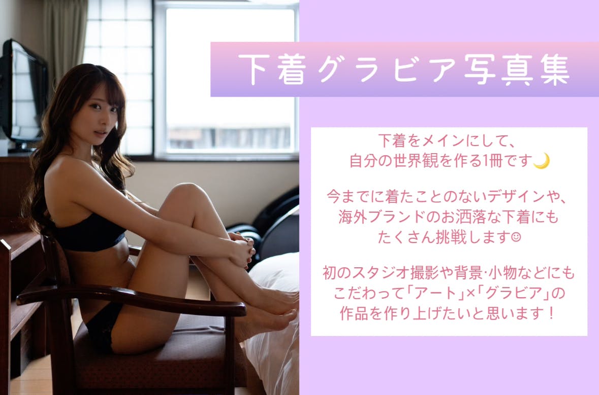 1つは、下着をメインにして、自分なりに世界観を作ってみたいなと考えています。スタイリストさんを付けて、今までに着たことのないようなデザインや、海外ブランドのお洒落な下着など、着用点数も過去の作品よりたくさん増やしたいなと思っています。