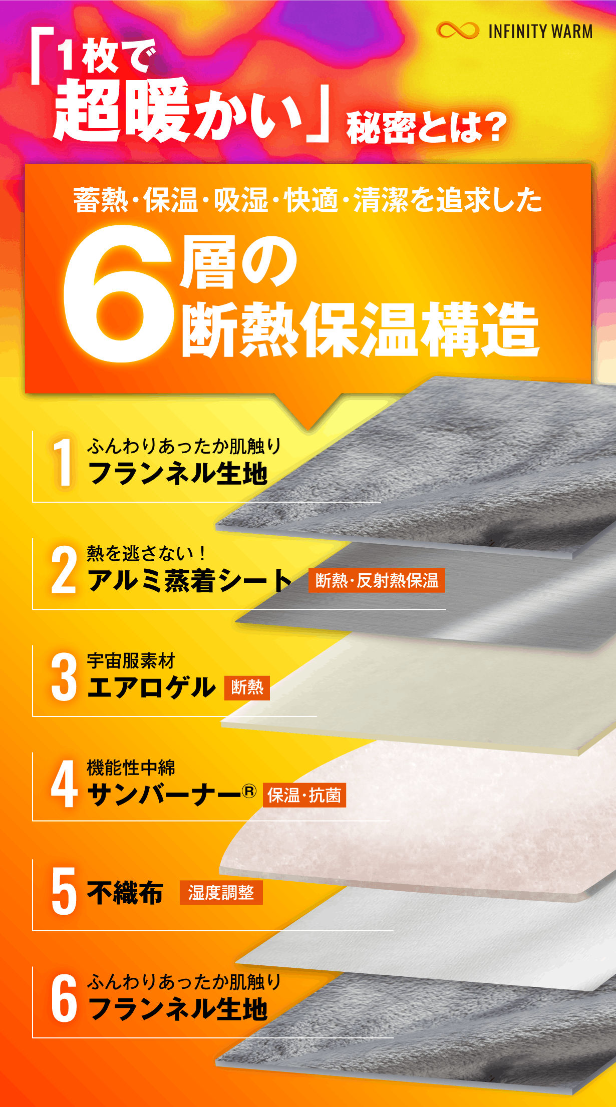 宇宙服素材の「エアロゲル」に加えて、熱を逃さない「アルミ蒸着シート」、さらに中綿には機能性中綿を採用。こだわり抜いた6層構造により、寒さをしっかり遮断しながら、快適な温もりをキープする掛け布団が誕生しました。