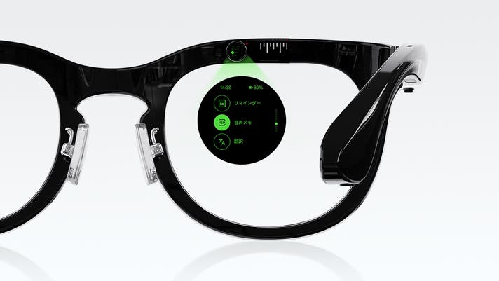 一見普通のメガネ。網膜投影技術で情報を視界にプライベート表示。見上げれば情報にすぐにアクセス。