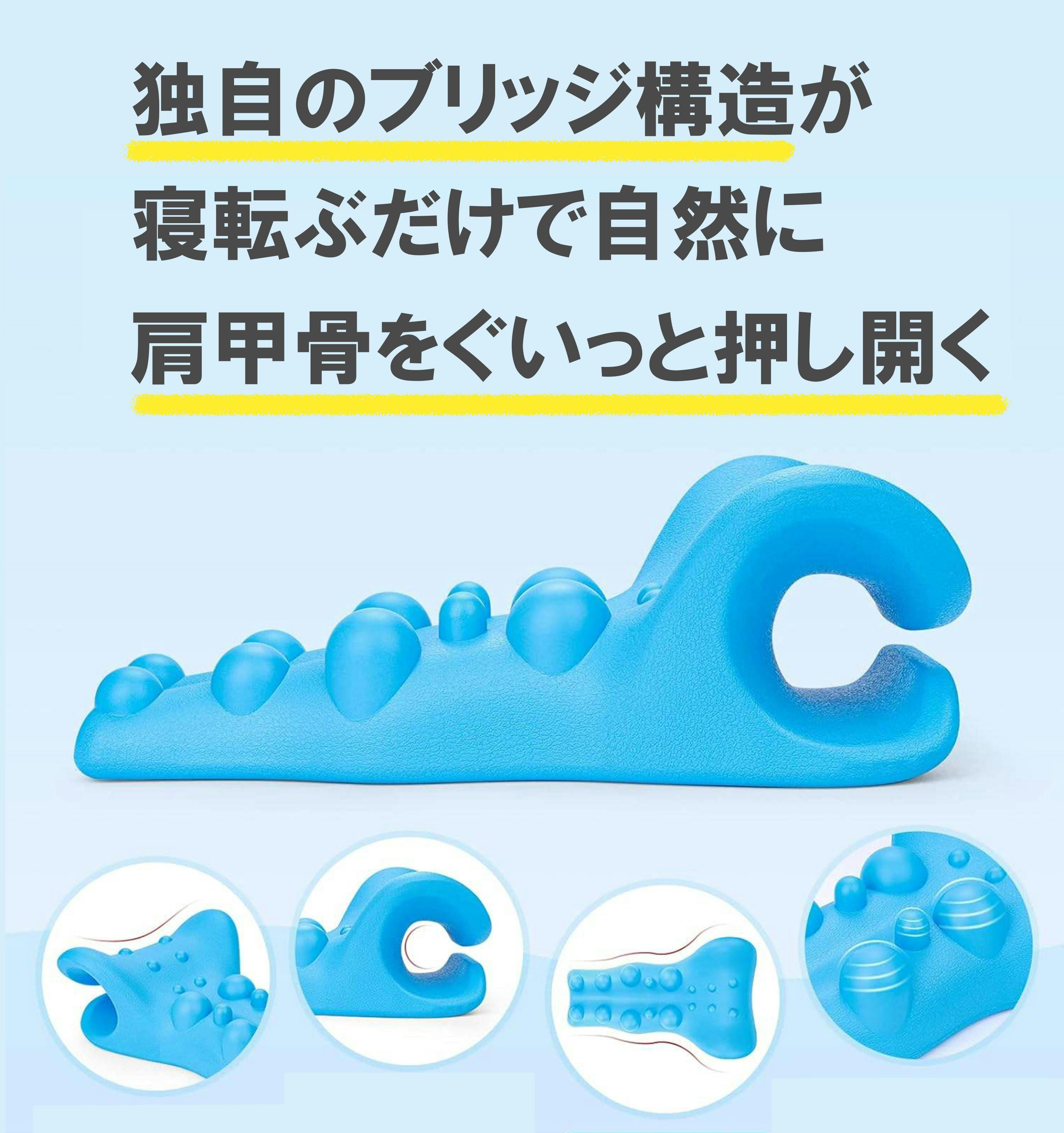 独自のブリッジ構造が、寝転ぶだけで自然に肩甲骨をぐいっと押し開き、奥までじんわり届くような心地よい伸び感。まるで整体師の手で“肩甲骨をはがされた”ような開放感を自宅で体感できます。