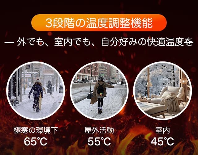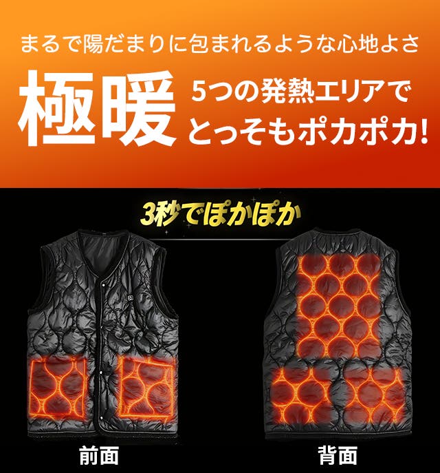 電源を入れた瞬間からじんわり広がる暖かさ。高効率カーボンファイバー発熱体により3秒で発熱し、最高65℃までしっかり加熱。わずか30秒で全身が包まれるような心地よさを実感できます。寒い朝や屋外作業でも頼れる即暖性能です