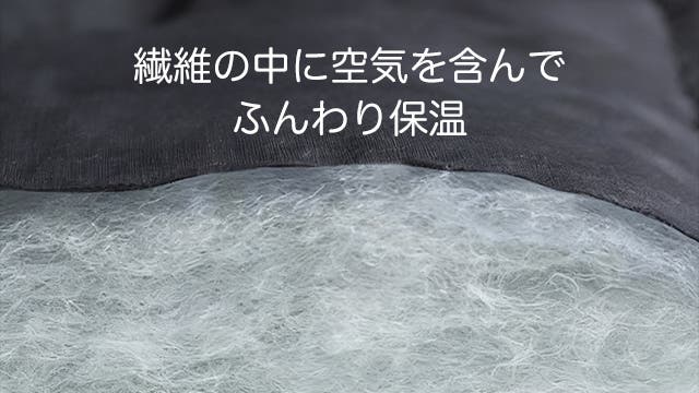中綿にはふくらみと保温性に優れた中空ポリエステル綿を採用。空洞のある繊維が温度をため込み、ヒーターの熱も逃がしません。軽いのにしっかり暖かく、洗濯後もへたりにくいのが特長です。