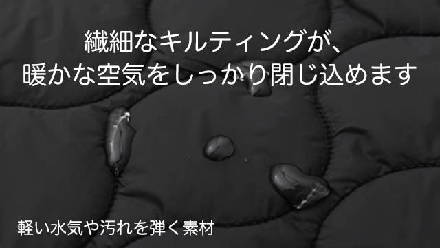 美しいステッチで仕上げたキルティング加工は、デザイン性だけでなく保温性にも貢献。縫い目ごとに断熱エアポケットが生まれ、暖かい空気を閉じ込めることで、軽さと保温力を両立します。また、生地に使われているナイロンは密度が高く、撥水加工をしています。飲み物をこぼしてしまった場合もすぐに拭き取けれ ば大きなシミか汚れにはなりにくいです。