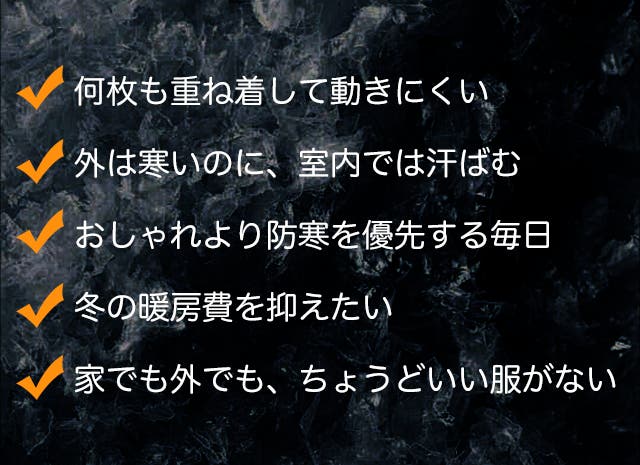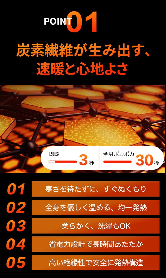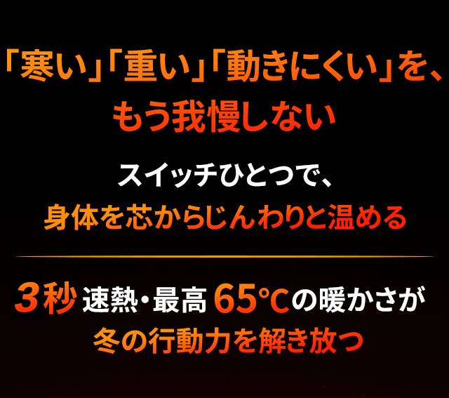 3秒で発熱、最大65℃。全身を均一に暖め、冬の寒さを忘れる心地よさを瞬時に実感できます。