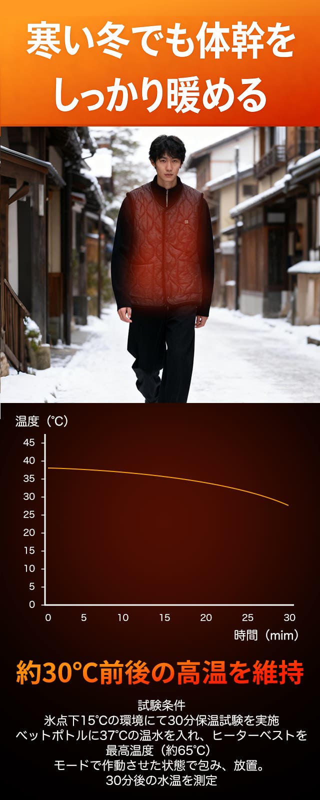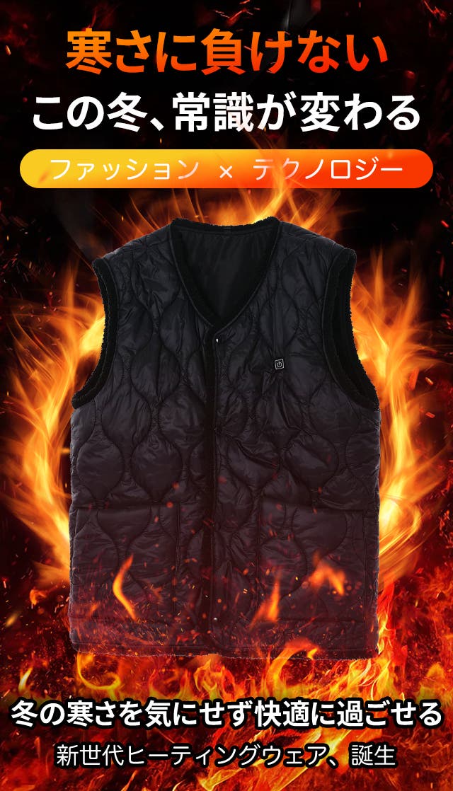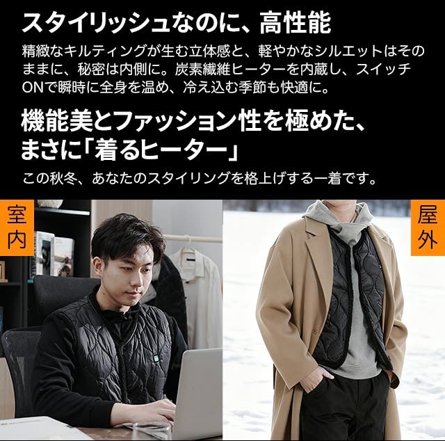 極寒環境でも体幹をしっかり暖める!※寒冷地での使用は、防風性のある冬用アウターとの併用がおすすめ。アウターと重ねることで、熱を閉じ込め、体幹を効果的に保温します。