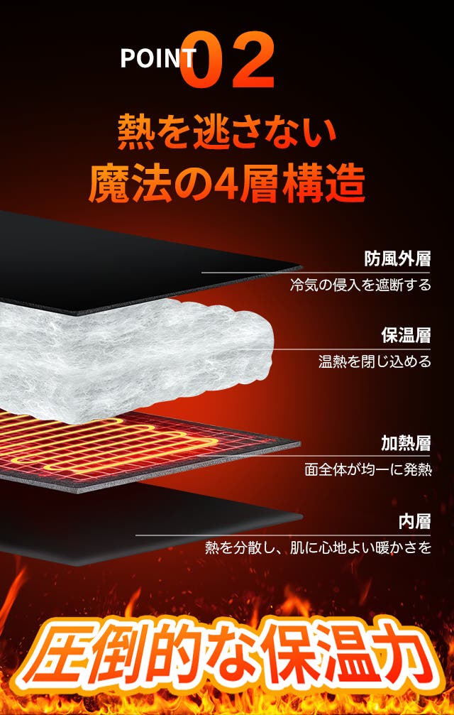 防風層・発熱層・中綿保温層・内側生地の4層構造が、軽さを保ちながら抜群の保温力を発揮。外気をしっかり遮断し、体温とヒーターの熱を閉じ込めるので、冬の厳しい寒さでも長く暖かさが続きます。